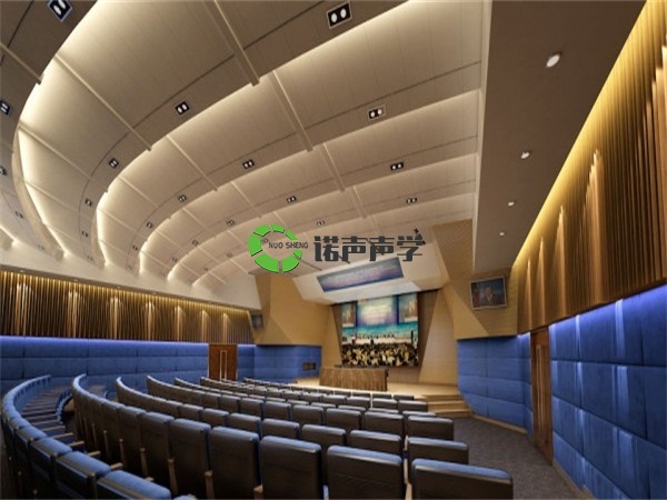 在會議廳內吸聲材料和結構具有控制混響時間和音質缺陷的雙重功能。由于會議廳采用短混響,因此,必須選用強吸聲的結構。又因強吸聲處理,因此建筑師經常采用各種容易引起聲學缺陷的體形,如圓形、橢圓形、卵形平面、穹形屋頂等。而控制音質缺陷的措施,除了配置擴散結構外,通常用強吸聲方法,因為它同時起到控制混響時間的作用。